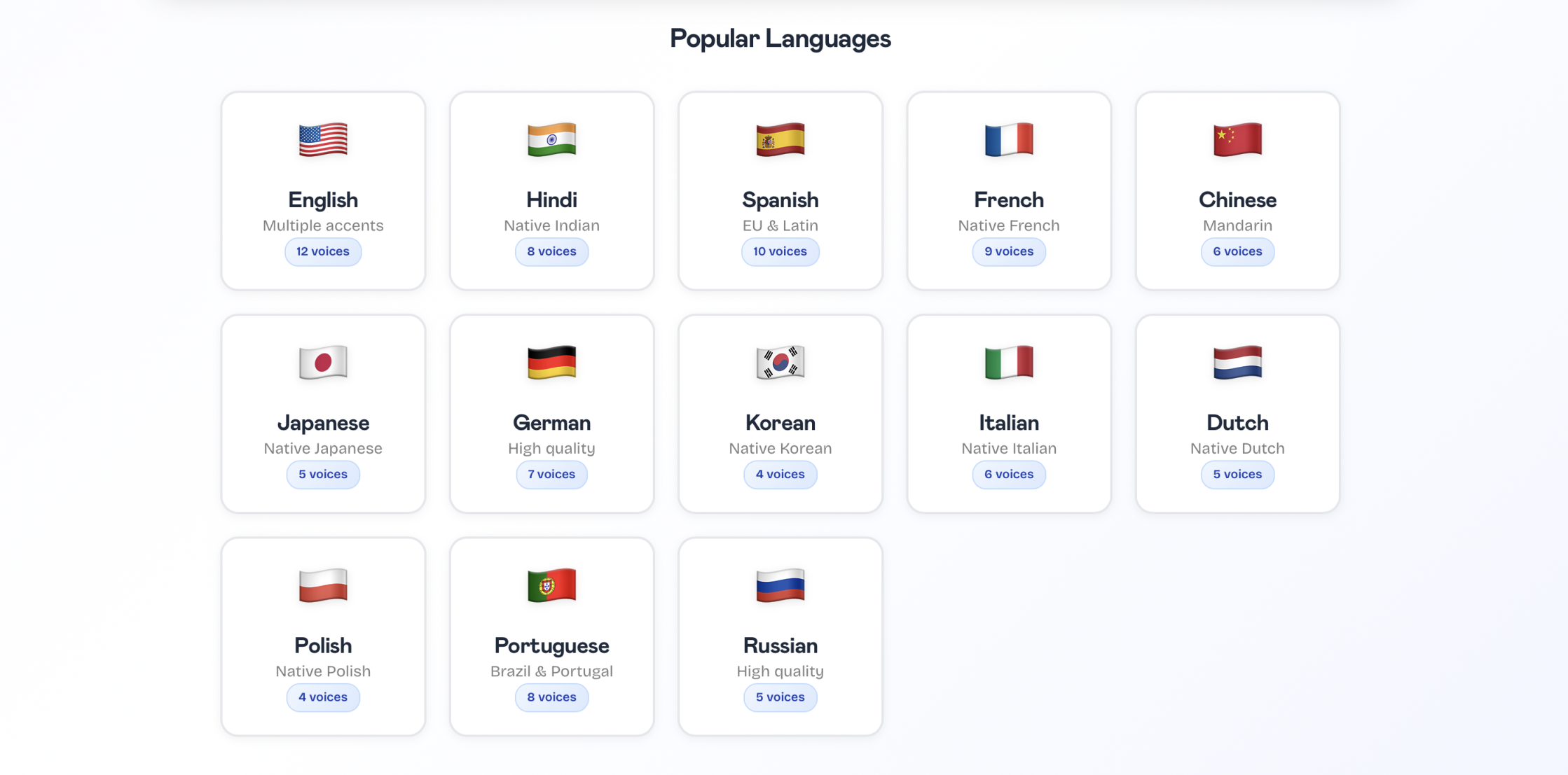 Tabbly.io supports 13 languages: English (American accent TTS), Hindi, Spanish, French, Chinese, Japanese, German, Korean, Italian, Dutch, Polish, Portuguese, and Russian.
